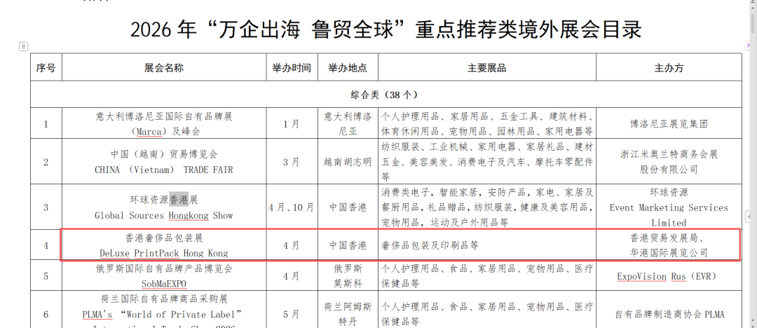廣東省商務(wù)廳率先在《2026年“粵貿(mào)全球”廣東商品境外展覽平臺清單》中將其列為官方認(rèn)證項(xiàng)目;與此同時,山東省商務(wù)廳在《2026年“萬企出海 魯貿(mào)全球”重點(diǎn)推薦類境外展會目錄》中,也明確將其展會體系中的高端組成部分——香港奢侈品包裝展——納入重點(diǎn)推薦之列。