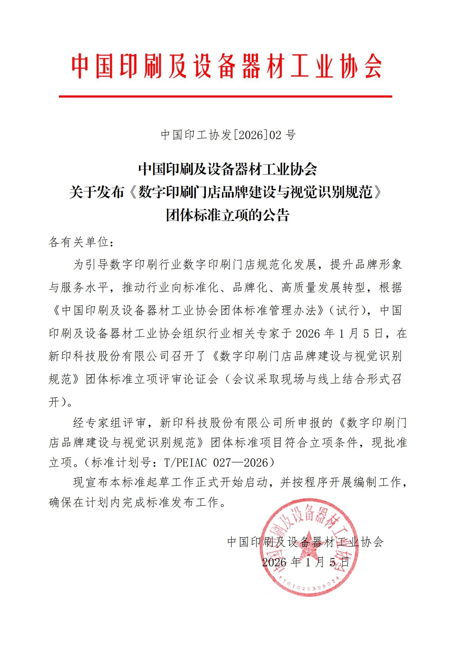 經專家組評審,新印科技股份有限公司所申報的《數字印刷門店品牌建設與視覺識別規范》團體標準項目符合立項條件,現批準立項。(標準計劃號:T/PEIAC 027—2026)