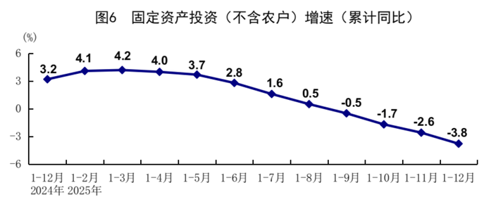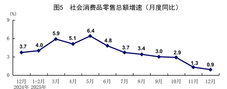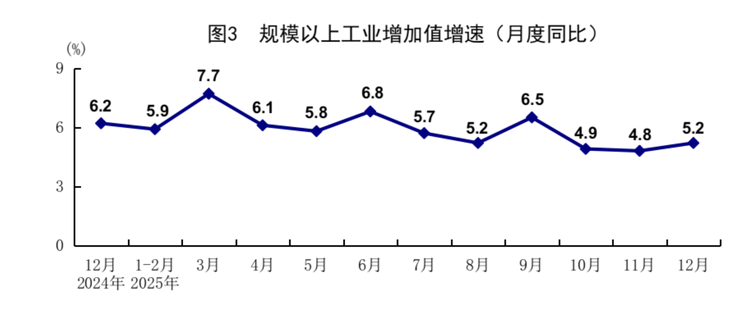 工業增加值:2025年全年,規模以上工業增加值同比增長5.9%,12月,同比實際增長5.2%。