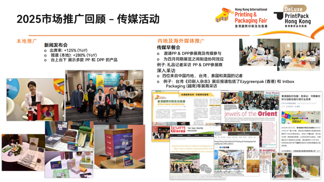 邀請中國內地、臺灣、泰國、英國等多地記者參與展會報道,展后獲臺灣《印刷人雜志》等專業媒體專題報道;新聞發布會出席率同比增長125%,本地報道量同比增長280%。