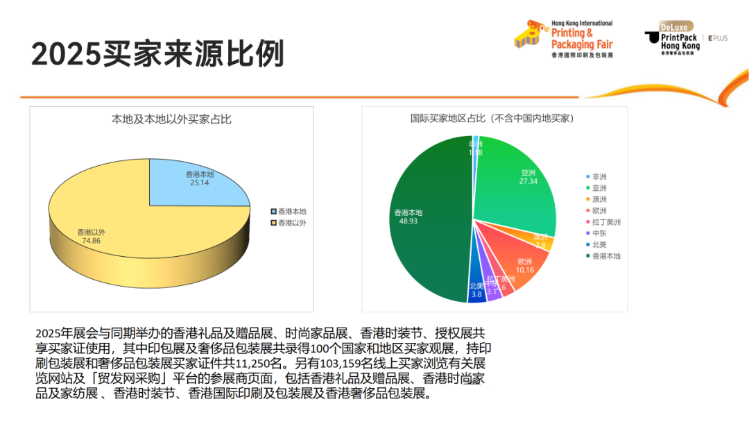 作為國際展覽聯盟(UFI)認證的專業品牌展會,香港印包展的規模與影響力持續升級。2025年展會共吸引來自6個國家和地區的494家參展商,覆蓋印刷服務、包裝方案、電商包裝、食品包裝、耗材及設備等全產業鏈環節;買家覆蓋全球100余個國家和地區,線上線下聯動進一步拓展了商貿半徑。參展商滿意度較2024年全面提升,在展位布局、買家精準度、商貿對接效率等關鍵指標上均實現同比增長。