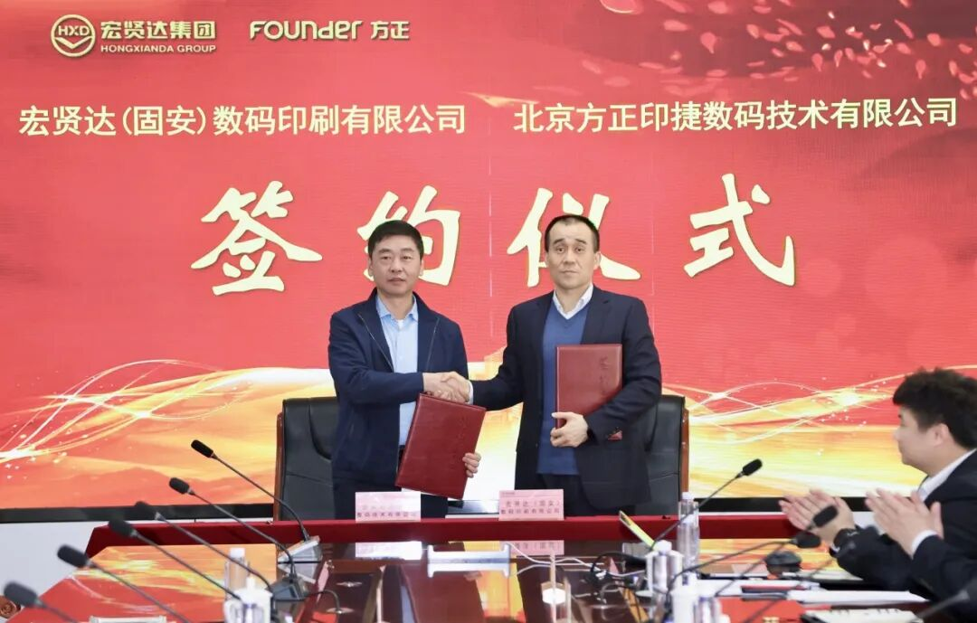 4月10日,方正印捷與北京宏賢達物流集團有限公司旗下宏賢達(固安)數碼印刷有限公司在河北固安舉辦印刷設備采購簽約儀式。雙方正式簽署協議,宏賢達集團引進2臺方正桀鷹P8800HD高清黑白噴墨輪轉印刷機,共同推動圖書按需印刷(POD)與出版供應鏈深度協同發展。