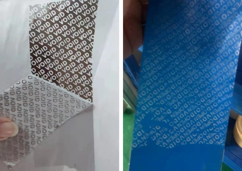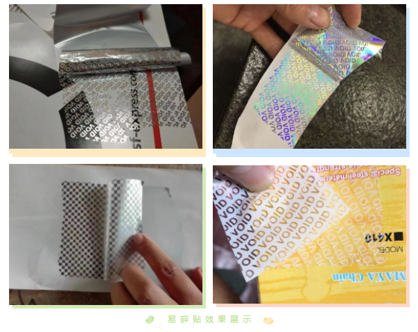 合成易碎紙不干膠材料具有易碎分層的特點(diǎn),采用高強(qiáng)度持粘能力的粘合劑,其粘合能力遠(yuǎn)大于面材本身的易碎分層強(qiáng)度,合成易碎紙不干膠面材經(jīng)印刷,模切等工序加工后制成易碎貼,貼到商品上就不能完整揭下來(lái),從而避免了造假者利用真品商標(biāo)來(lái)推銷假冒偽劣商品的可能。