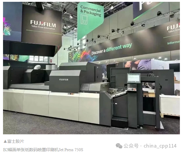 通過走訪發現,本屆德魯巴展會上,眾多展商推出了大幅面數字噴墨印刷設備。瀾達推出新一代B1幅面的S11和S11P納米圖像印刷機,全新型號的印刷機將提供極高的生產多功能性,同時達到11,200 sph的印刷速度;柯尼卡美能達重磅亮相的One Pass B1+數字噴墨印刷機MGI AlphaJet,創新地將四色印刷、干燥、局部UV和燙金等獨立工序整合成一體化的生產流程;惠普推出全新Indigo 120K HD數字印刷機,速度高達6000張/小時(B2),每月可印刷超過兩百萬張(B2);佳能推出的新型B2+噴墨印刷機varioPress iV單面印刷速度為8,700sph,雙面印刷速度為4,350sph; 富士膠片帶來的B2幅面單張紙數碼噴墨印刷機Jet Press 750S,采用旗下SAMBA噴頭,現場連線UV光油,呈現的包裝應用解決方案吸引了眾多專業觀眾……