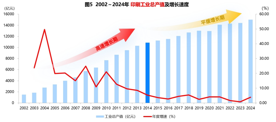 我們再來看下本世紀以來全行業產值規模的發展軌跡,2002-2024年的情況(見圖5)。2002年,印刷產業的總盤子是1500億元,到2024年已經有1.5萬億元,20余年間整整增長了10倍。其實在上世紀最后10年,到本世紀初的10年,印刷業一直處于“高速增長期”,每年增速基本都是兩位數增長。但自拐點2014年以后,增速基本沒超過5%,我們印刷業已經歷了10年的“平緩增長期”。